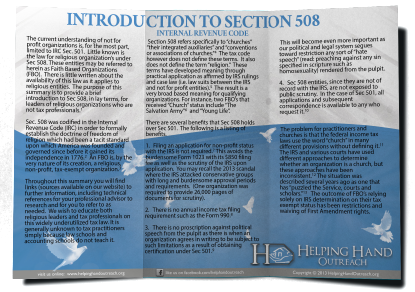 The current understanding of not for profit organizations is, for the most part, limited to IRC Sec. 501. Little known is the law for religious organizations under Sec 508. These entities may be referred to herein as Faith Based Organizations (FBO). There is little written about the availability of this law as it applies to religious entities. The purpose of this summary is to provide a brief introduction to Sec 508, in lay terms, for leaders of religious organizations who are not tax professionals. [1]