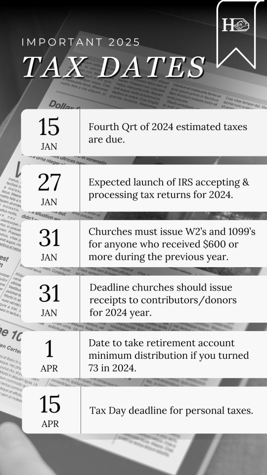 - Jan 31 – Deadline churches should issue receipts to contributors/donors for 2024 year